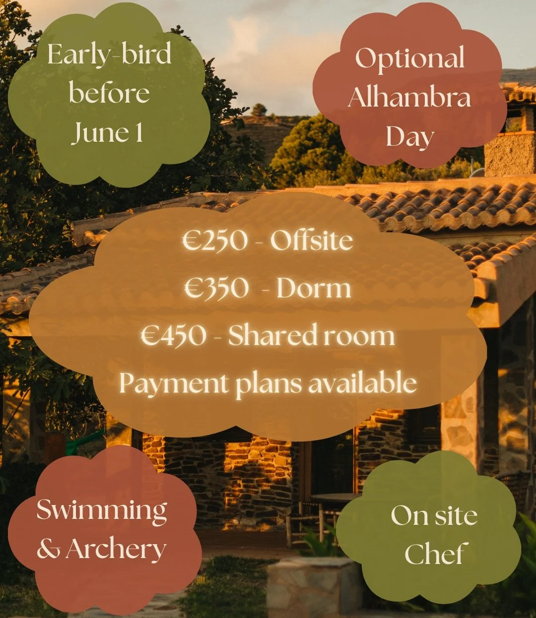 The retreat runs from 9.30am - 5.30pm on 11 October through 13 October, so we recommend arriving to Spain on the evening of 10th October.
